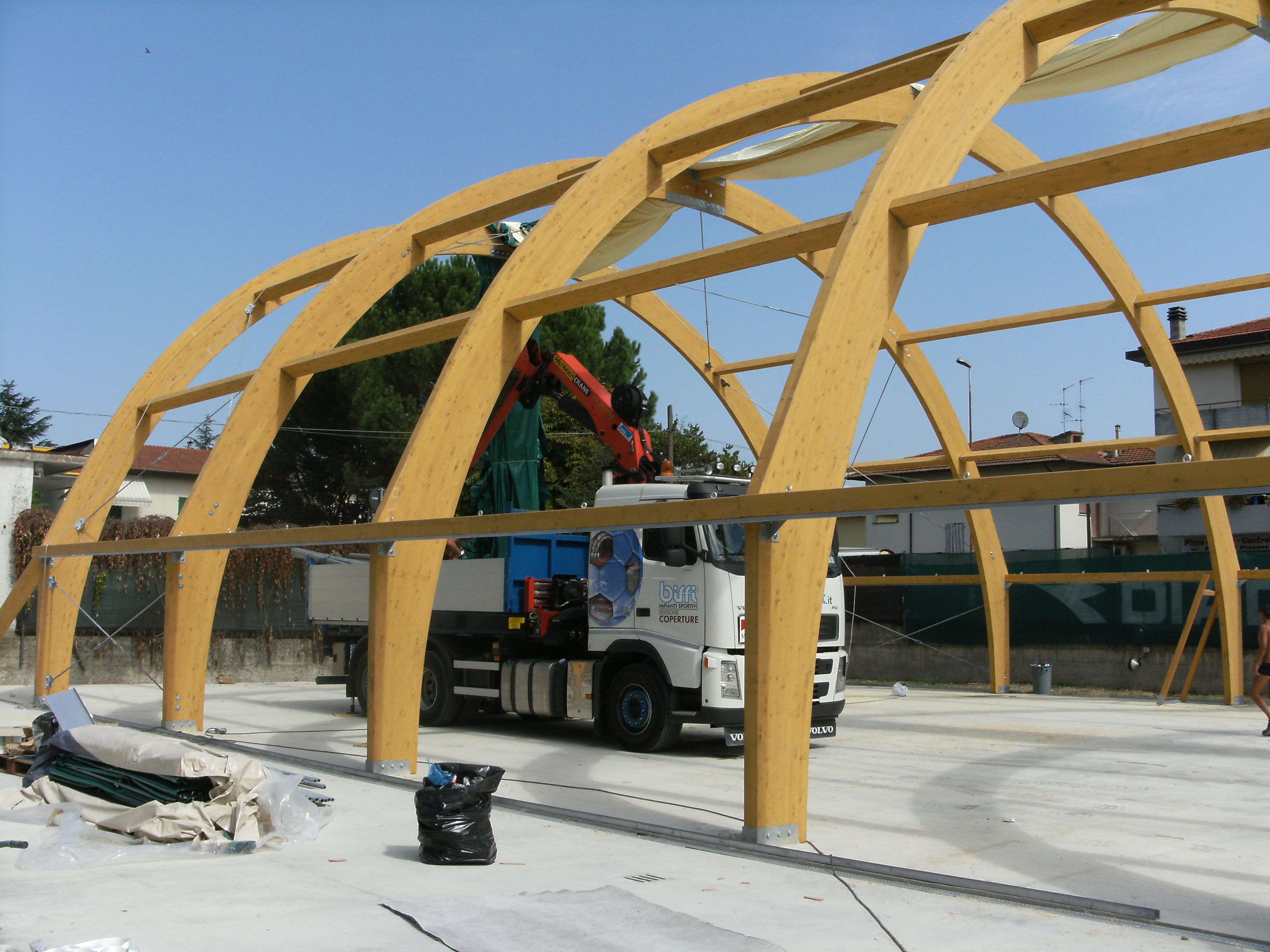 Copertura del campo da tennis al MatassinoE' in programma per le 9,30 di domenica 18 ottobre il taglio del nastro per la copertura del campo da tennis del Matassino, che permetterà ai tanti iscritti al Tennis Club Figline di giocare anche in caso di pioggia o basse temperature. L'intervento, infatti, è stato voluto dall'Amministrazione comunale per consentire ai tanti appassionati di questa disciplina di poter giocare a prescindere dalle condizioni meteorologiche. I lavori, iniziati dopo Ferragosto, hanno previsto il montaggio di una struttura in legno lamellare composta da sei arcate portanti di forma semicircolare collegate tra loro. Il tutto è stato coperto con tessuto poliestere confezionato in modo da avvolgere completamente la struttura fino a terra; infine, è stato collocato un nuovo manto di gioco in sintetico. La scelta della struttura è stata effettuata sulla base delle preesistenti condizioni paesaggistiche, in modo da garantire il minor impatto visivo possibile. L'opera ha inoltre previsto la demolizione delle vecchie tribune e il rifacimento di tutti gli impianti elettrici.