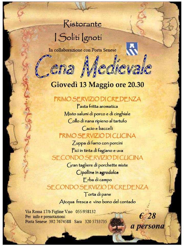 Cena MedievaleLa Contrada Storica di Porta Senese, la Compagnia della Torre d’Argento, comunica di aver organizzato a Figline Valdarno una CENA MEDIEVALE che a partire dalle ore 20.30 di giovedì 13 maggio si svolgerà presso il Ristorante de “I Soliti Ignoti”, in via Roma n.° 17/b. La partecipazione è aperta alle altre Contrade storiche ed alla cittadinanza, previa prenotazione ai numeri di cellulare 392-7674588 e 320-5733735. La serata vedrà la partecipazione dei figuranti della nostra contrada, che indosseranno costumi storici dei secoli XIV° e XV°. Saranno nostri graditi ospiti il sindaco Riccardo Nocentini e l’Assessore alle Attività Produttive, al Commercio ed al Turismo, signora Caterina Cardi. Nel corso della cena saranno servite tipiche pietanze Medievali, dalle quali saranno bandite condimenti e contorni non “filologici”, che all’epoca non erano ancora presenti sulle nostre tavole, come ad esempio il pomodoro e le patate giunte in Europa ed in Italia solo in seguito alla scoperta delle Americhe. Questo evento s’inserisce nel solco delle iniziative promosse dalla nostra Contrada volte alla riscoperta ed alla valorizzazione delle antiche tradizioni del territorio, di cui la cucina rappresenta un aspetto ancora oggi fondamentale. È nostro auspicio rendere questa iniziativa un tradizionale incontro annuale, per riscoprire e proporre ogni anno pietanze e bevande sempre diverse, ma tipiche del periodo storico di nostro interesse, compreso tra i secoli XIV° e XVI°.