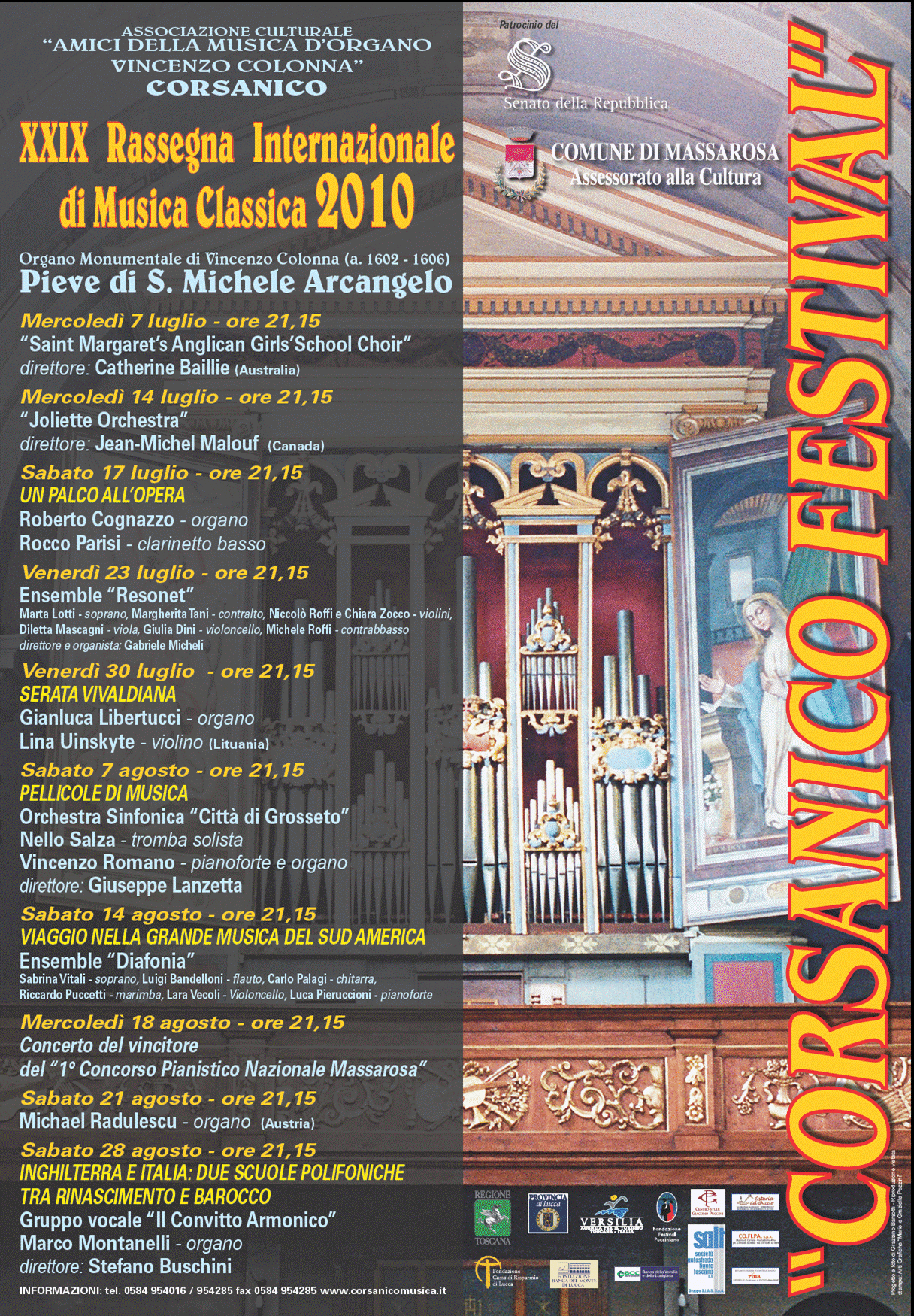 Apertura internazionale per la XXIX edizione del Corsanico FestivalDirettamente dall'Australia il concerto di inaugurazione della XXIX edizione del Corsanico Festival 2010. Nella suggestiva Pieve di San Michele Arcangelo a Corsanico mercoledì 7 luglio alle ore 21,15 la rassegna internazionale di musica classica, che quest'anno vanta il patrocinio del Senato della Repubblica, ospita, nella sezione riservata ai cori e alle orchestre giovanili, il St Margaret's Anglican Girls School Choir “Encorah”. Vincitore nel 2006 del Premio Kathaumixw Choral Festival in Canada e tra i finalisti per il titolo Choir of the World, il coro diretto dalla bravissima Catherine Baillie, intratterrà il pubblico con un repertorio classico e sacro eseguito