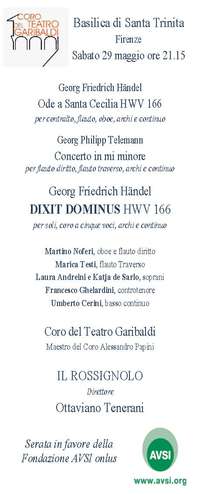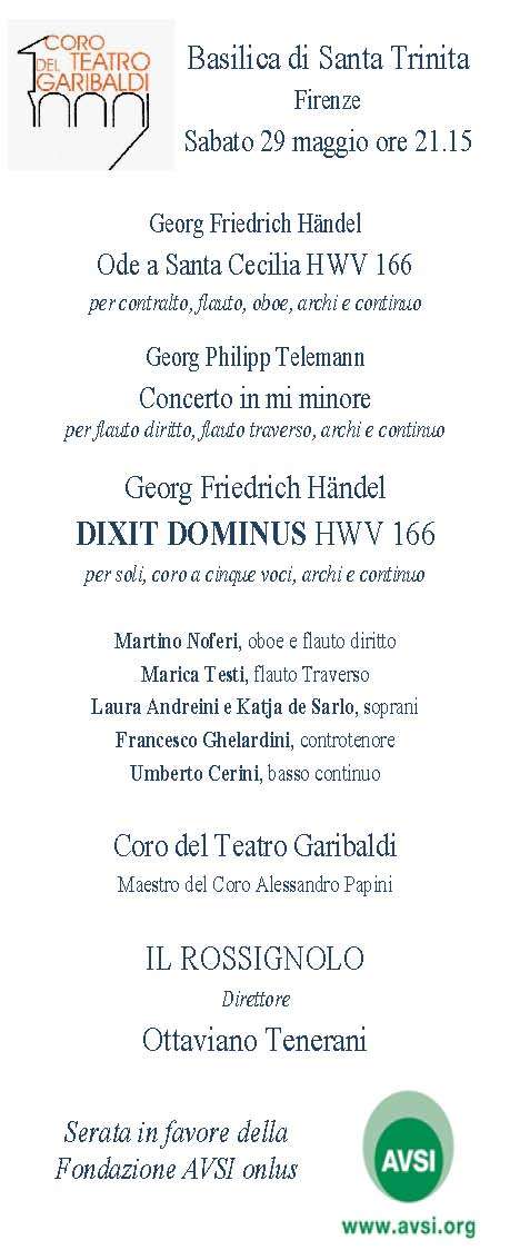 L'ensemble barocco "Il Rossignolo" e il Coro del Teatro Comunale Garibaldi di Figline Valdarno presentano, sabato 29 maggio alle ore 21.15 nella Basilica di Santa Trinita a Firenze, il Dixit Dominus di Georg Friedrich Haendel per soli, coro a cinque voci e orchestra.