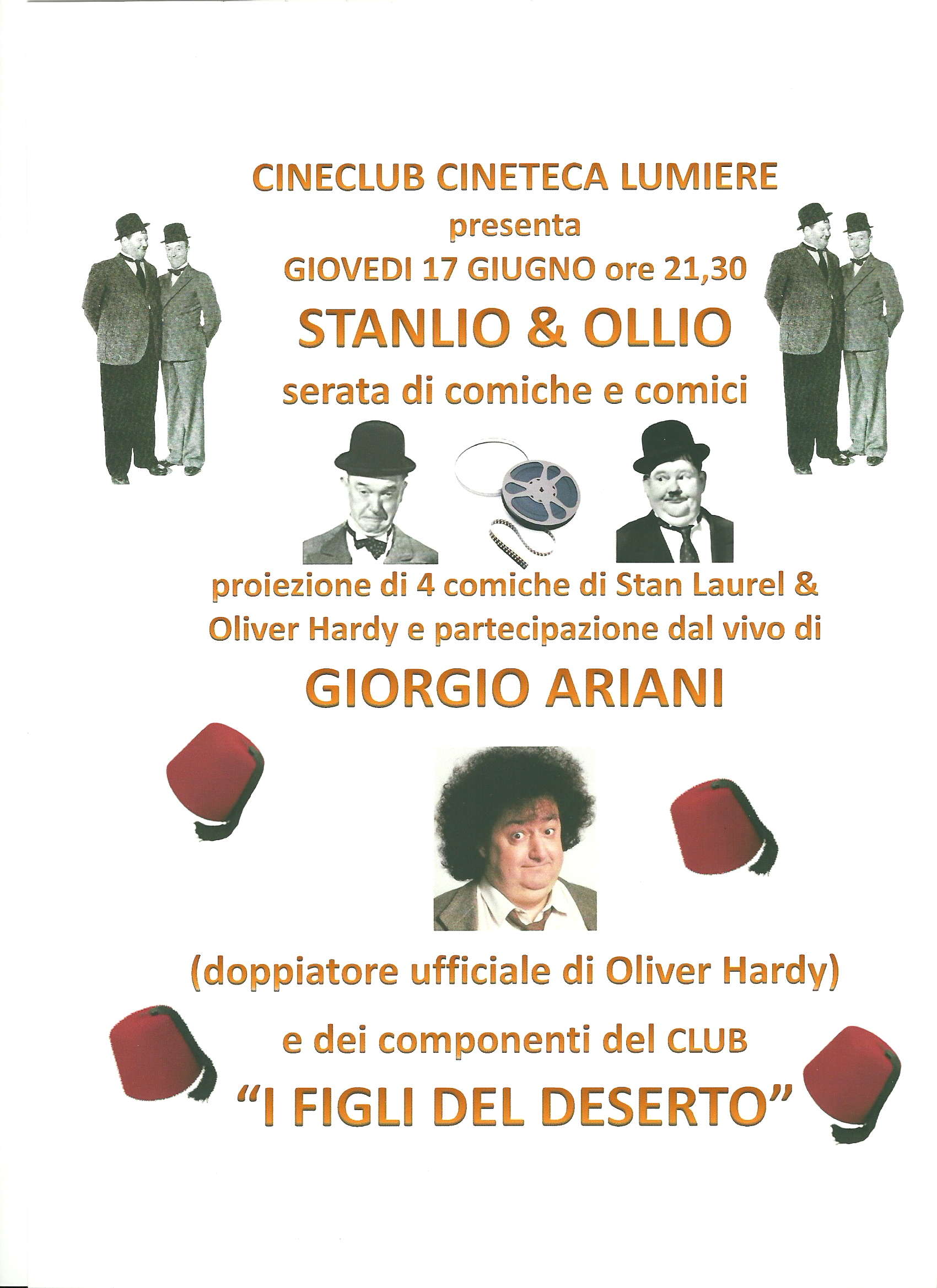 STANLIO E OLIO - SERATA DI COMICHE E COMICIIl Cineclub Cineteca Lumiere e lieto di comunicare che alla proiezione del film su Stanlio e Ollio, che avrà luogo giovedì 17 giugno presso la Villa Casagrande di Figline Valdarno alle ore 21,30, saranno presente i comici “I Figli del Deserto” e il grande Giorgio Ariani doppiatore ufficiale di Oliver Hardy.