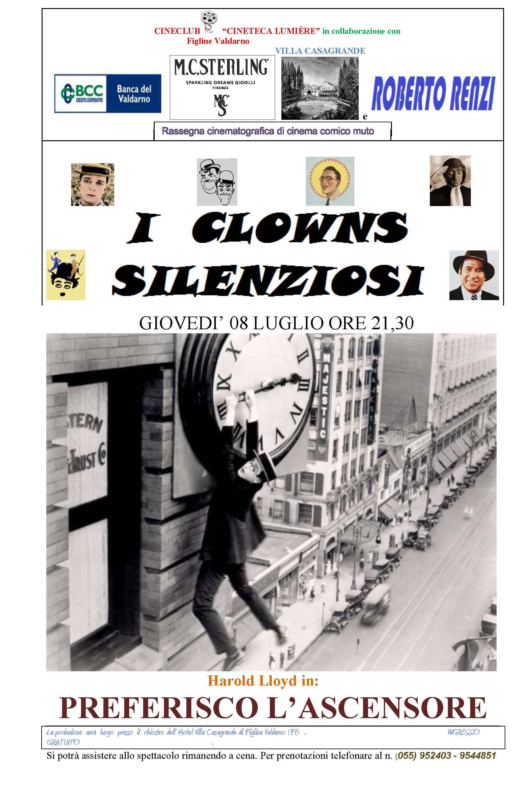 Il cineclub Lumiere visto il successo avuto nelle prime due proiezioni, che hanno visto graditi ospiti il gruppo musicale di Giovanni Baglioni, i comici “I Figli del Deserto” il Presidente dei club italiani Tiziano Medici di Modena ed Alessandro Santi di Prato e naturalmente il doppiatore ufficiale di Oliver Hardy il comico fiorentino Giorgio Ariani, è lieto di comunicare che giovedì 8 luglio alle ore 21,30 presso hotel Villa Casagrande proietterà il Film "PREFERISCO L'ASCENSORE" con Harold Lloyd.