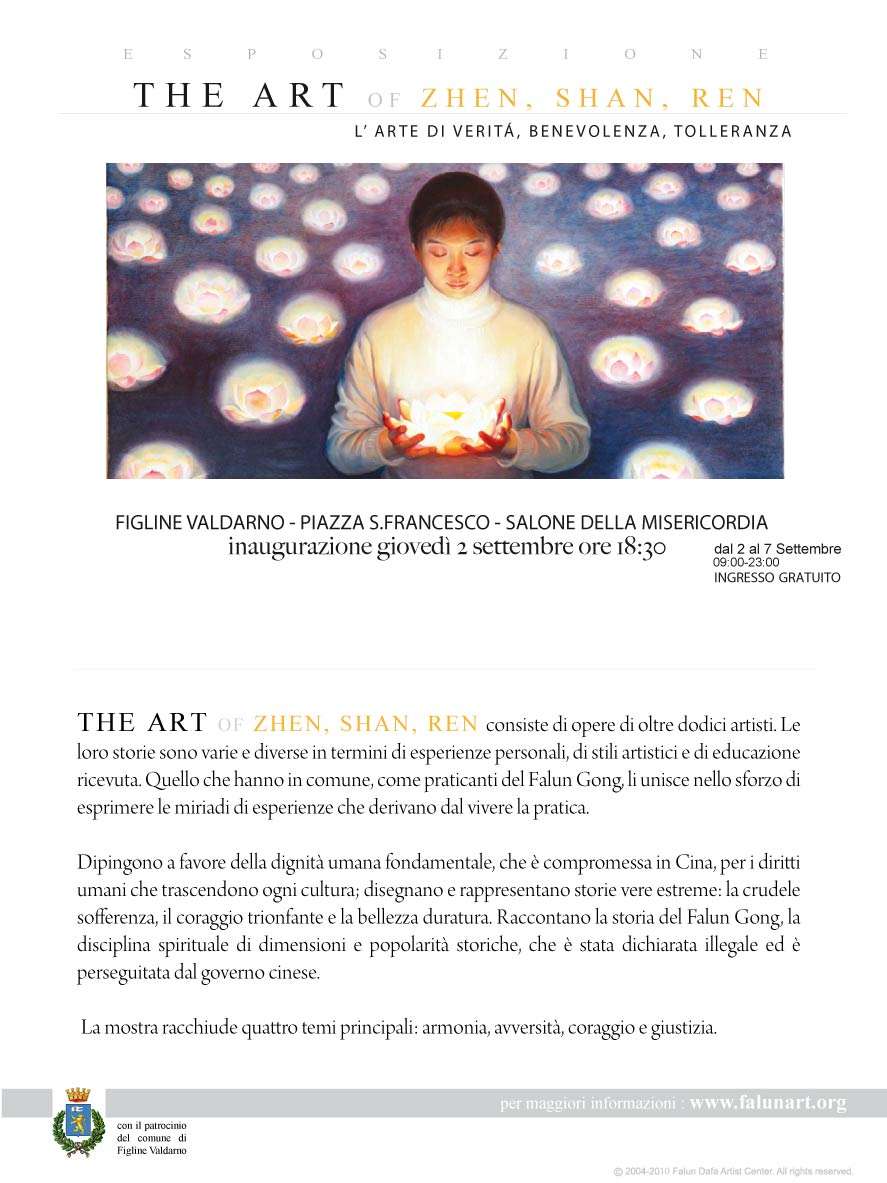 Mostra d'arte "Zhen Shan Ren" a Figline ValdarnoL'associazione culturale onlus 'Il Ponte', dal 2 al 7 settembre, esporrà presso la sala della Misericordia in piazza San Francesco a Figline Valdarno, la Mostra d'arte Internazionale "Zhen Shan Ren" ('Verità, Benevolenza, Tolleranza'), L'ingresso, dalle 9:00 alle 23:00, è gratuito.