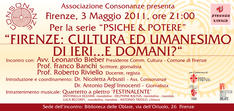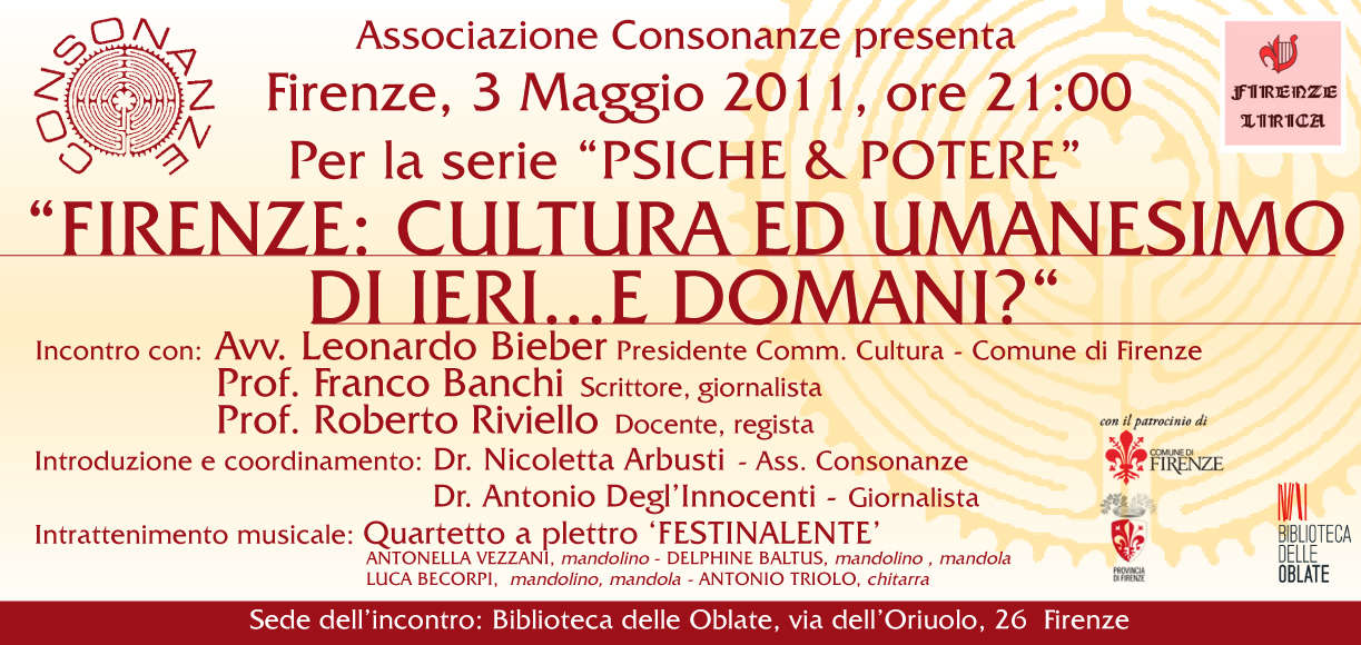 L' Associazione Consonanze, presieduta dalla psicoterapeuta Dott.sa Arbusti, organizza una tavola rotonda presso la Biblioteca delle Oblate su un tema di grande rilevanza: il ruolo della città di Firenze nella storia e nella cultura, e le sue attuali prospettive di rilancio. Se è indubitale che Firenze è stata la capitale della grande tradizione umanistica, è oggi necessario pensare quali strategie di politca culturale si debbano mettere in atto per restituirle l' importanza che merita. L' incontro di mercoledì 2 maggio metterà a confronto l' opinione di un autorevole esponente dell' Amministrazione comunale, Leonardo Bieber, con due intellettuali, Franco Banchi e Roberto Riviello, entrambi docenti dell' ISIS Vasari di Figline,che porteranno la discussione nell' ambito della storia, della filosofia e del cinema, in riferimento alla specifica realtà fiorentina.