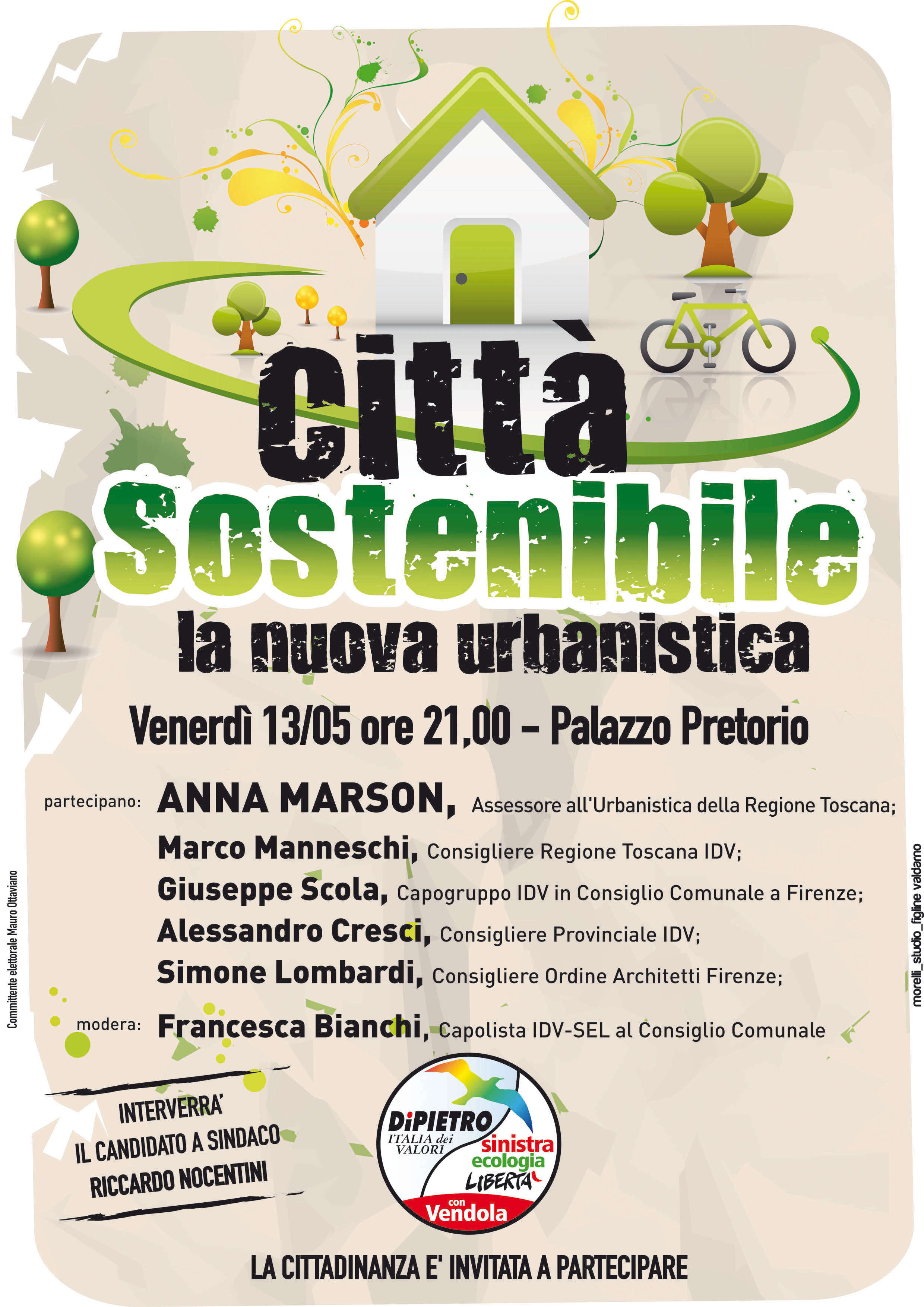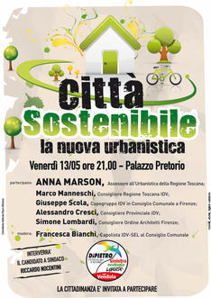 CITTA' SOSTENIBILE- LA NUOVA URBANISTICA, questo è il titolo dell'incontro conclusivo della campagna elettorale della Lista IDV-SEL di Figline Valdarno, che si terrà venerdì 13 Maggio alle 21,00 al Palazzo Pretorio. Parteciparanno Anna Marson Assessore Regionale all'Urbanistica, Marco Manneschi Consigliere Regionale, Giuseppe Scola Capogruppo IDV in Consiglio Comunale a Firenze, Alessandro Cresci Consigliere Provinciale IDV, Simone Lombardi Consigliere dell'Ordine degli Architetti di Firenze. La serata sarà moderata da Francesca Bianchi, candidata capolista IDV-SEL in Consiglio Comunale.