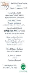 L'ensemble barocco "Il Rossignolo" e il Coro del Teatro Comunale Garibaldi di Figline presentano, sabato 29 maggio nella Basilica di Santa Trinita a Firenze, il Dixit Dominus di Georg Friedrich Haendel per soli, coro a cinque voci e orchestra.